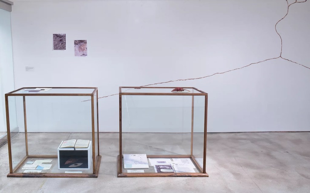 The map, hand-drawn on the gallery wall using clay and sumac, details Alize’s trek. As a Turkish-Canadian settler, sumac holds particular relevance for the artist because one strain of the plant is native to North America while another hails from Turkey. Sumac, then, creates a transnational link that carries within it the stories of this land and Alize’s heritage. Accompanying the wall drawing is a display of archival research and a soundscape that gently fills the gallery foyer. The soundscape transports us to the Scarborough Bluffs, where the artist is searching for Mendieta’s reliefs. We are both here in the gallery and there on the bluffs, listening to one artist’s work while hearing about another’s. It is in this soundscape that we become privy to the connections between Zorlutuna and Mendieta’s practices. While contemplating the question herself, Zorlutuna asks us, “What is your relationship to this land?”By doing so, Zorlutuna resists the colonial notion that one’s relationship to the land they inhabit is simply one of ownership, and prompts a more in-depth consideration of one’s personal relation to the Scarborough landscape and also their historical connection to Canada as a whole.