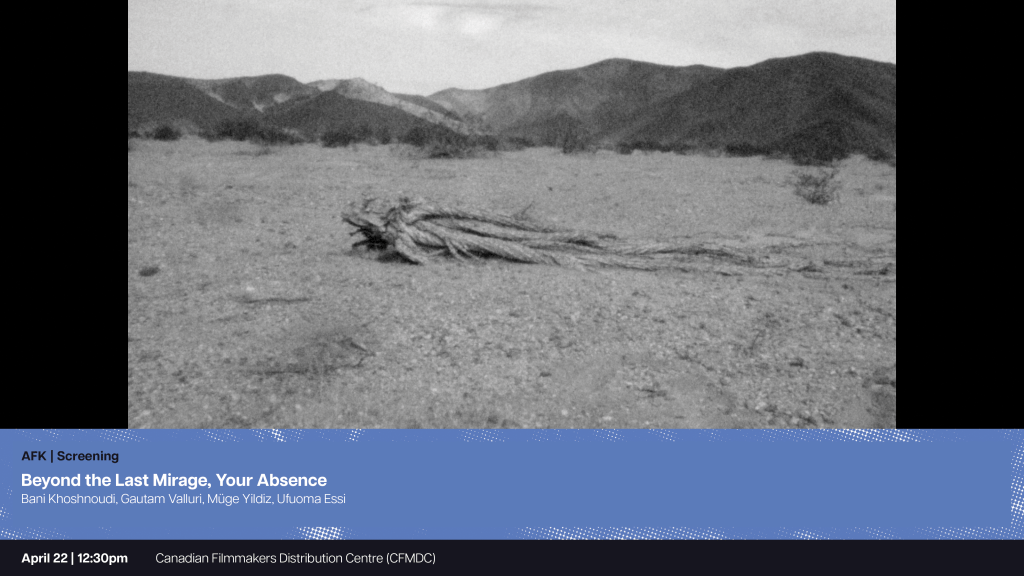 In Beyond the Last Mirage, Your Absence, four analogue films which have since been digitized by Ufuoma Essi, Gautam Valluri, Müge Yildiz, and Bani Khoshnoudi are presented in an intimate screening at the Canadian Filmmakers Distribution Centre (CFMDC). These four filmmakers formally explore absence through land—and city —scapes to a visually and spiritually haunting effect.