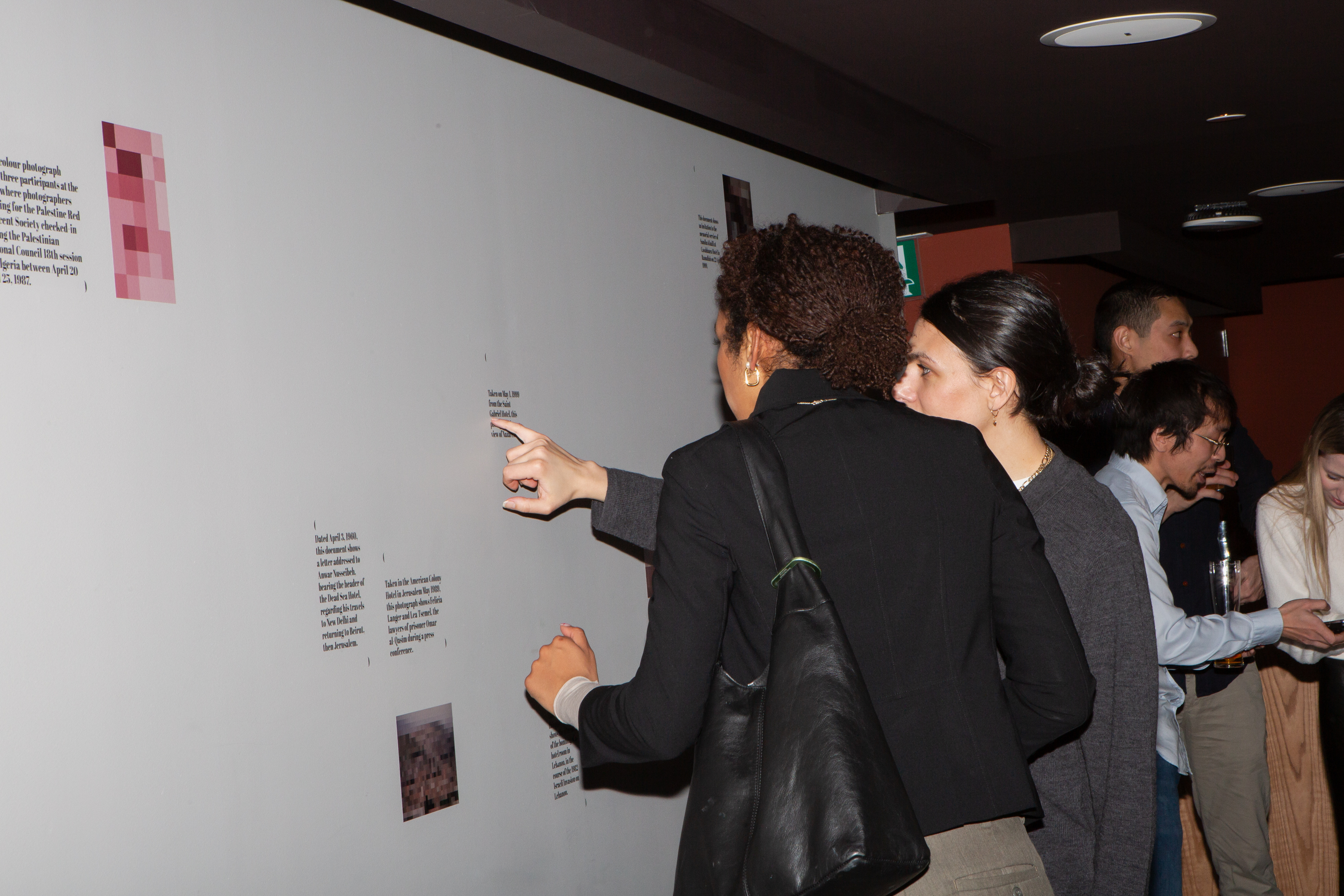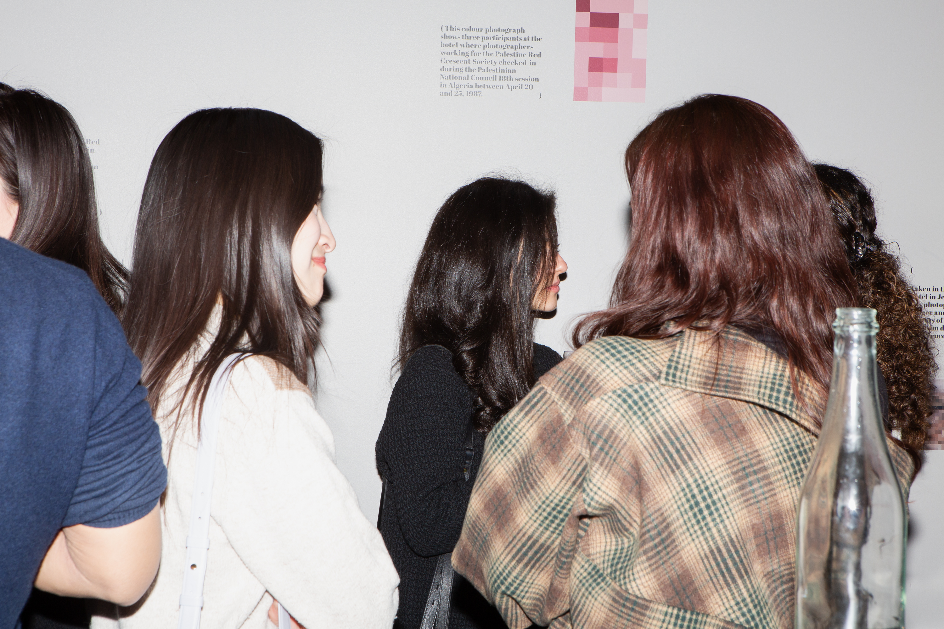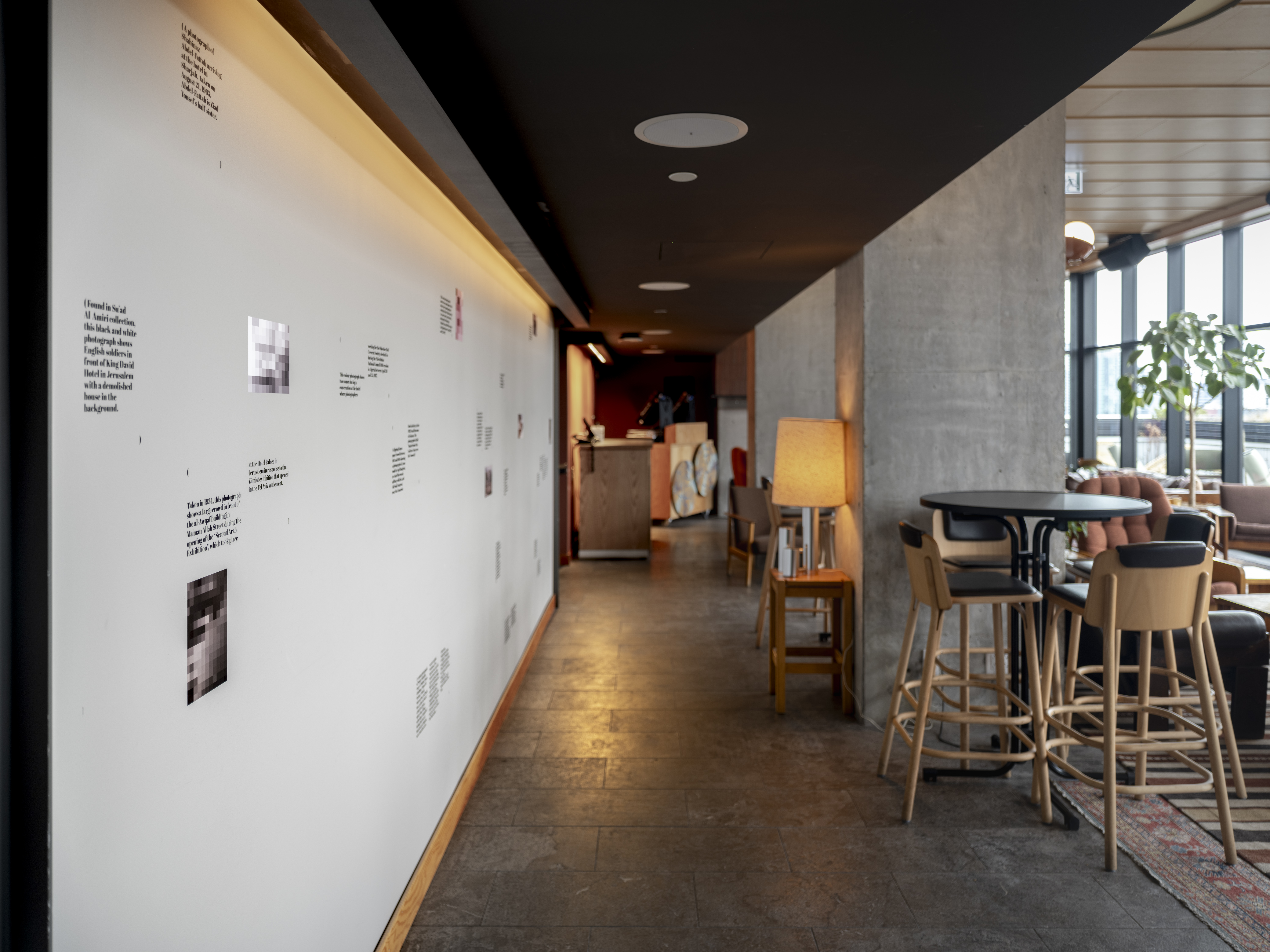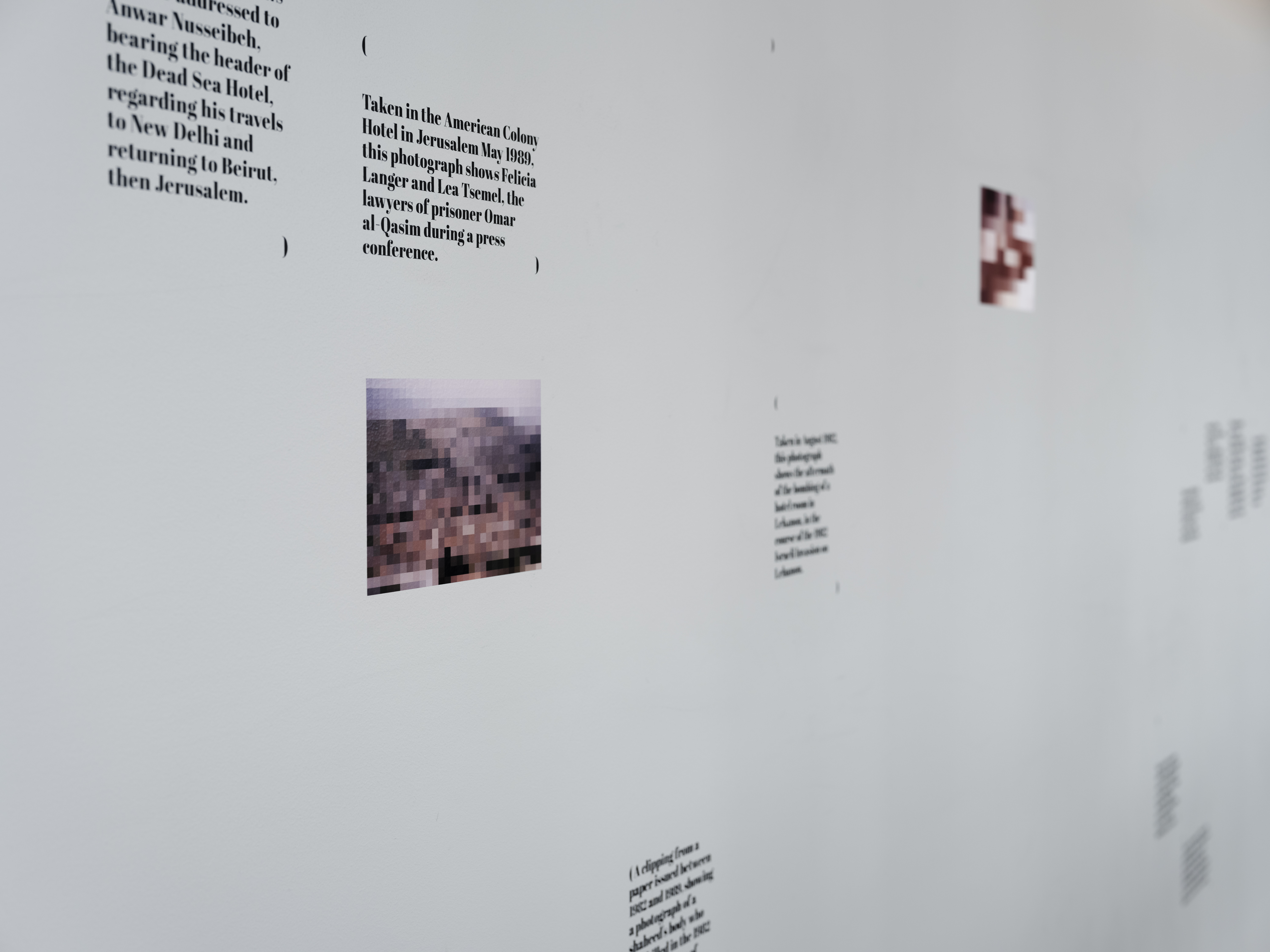 The installation, Notes for a Guest Book by Nour Bishouty, is a collection of images and texts that consider the hotel as an omnipresent spectre always appearing as a witness, attesting to moments of gathering, remembering, collective action, celebration, as well as war, violence, and exile. Pulled from the Palestinian Museum Digital Archive, the collected materials act as visual records documenting moments from the history of Palestine’s colonization. These vistas articulate alternative voices of resistance.